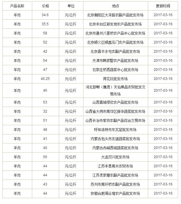2017年3月16日各地批发市场羊肉价格